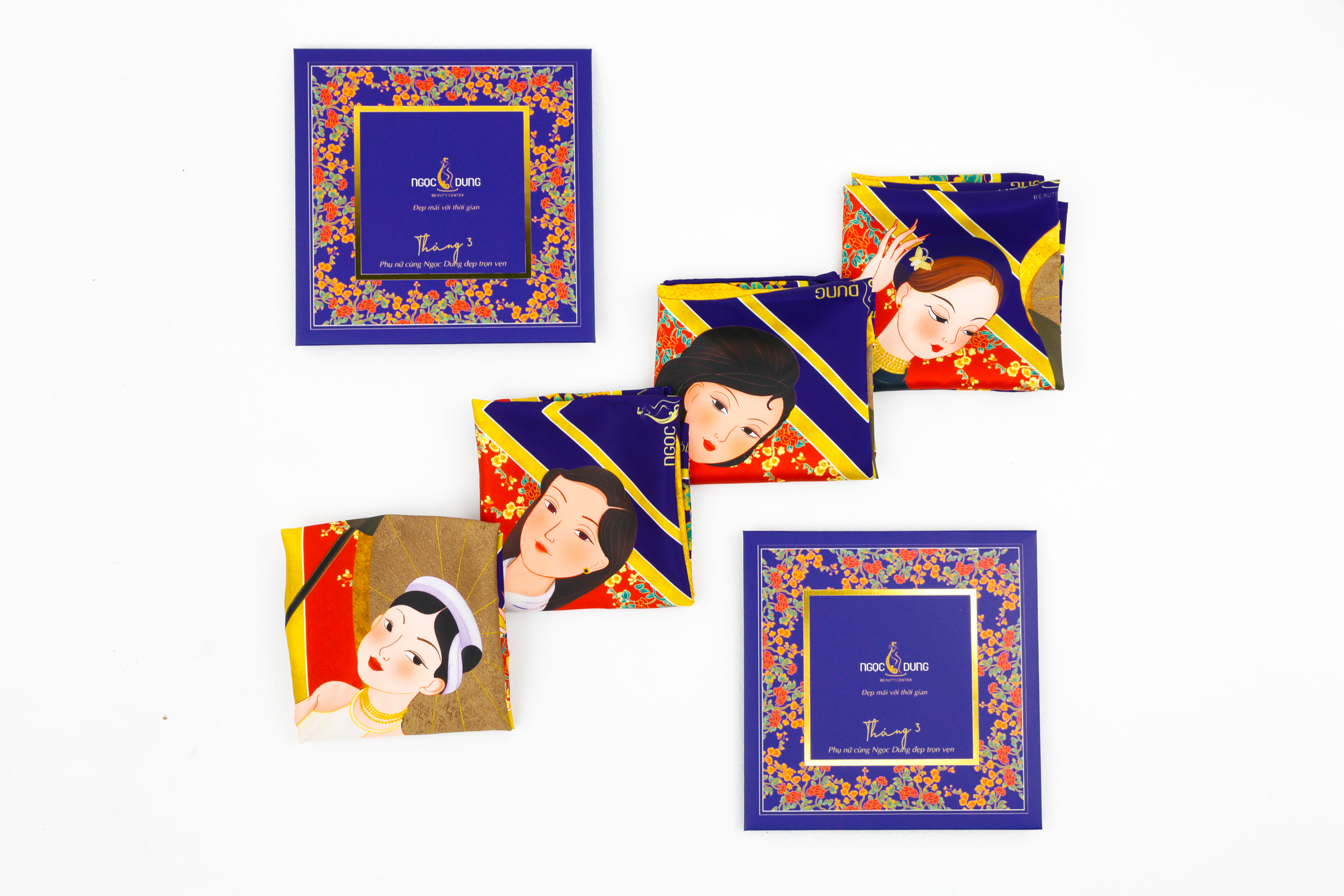Khăn lụa phiên bản đặc biệt được thiết kế 4 hình ảnh phụ nữ là đại diện cho 4 thời kỳ đặc trưng của Việt Nam. Hình ảnh kết hợp các nét vẽ truyền thống với hội họa hiện đại khắc họa sống động vẻ đẹp của phụ nữ Việt. Màu sắc phối hợp hài hòa, sang trọng giúp khăn lụa tăng thêm phần nổi bật. Với phiên bản đặc biệt này, khăn lụa có thể làm quà tặng lưu niệm, sử dụng làm khăn quàng cổ hoặc trang trí túi sách…