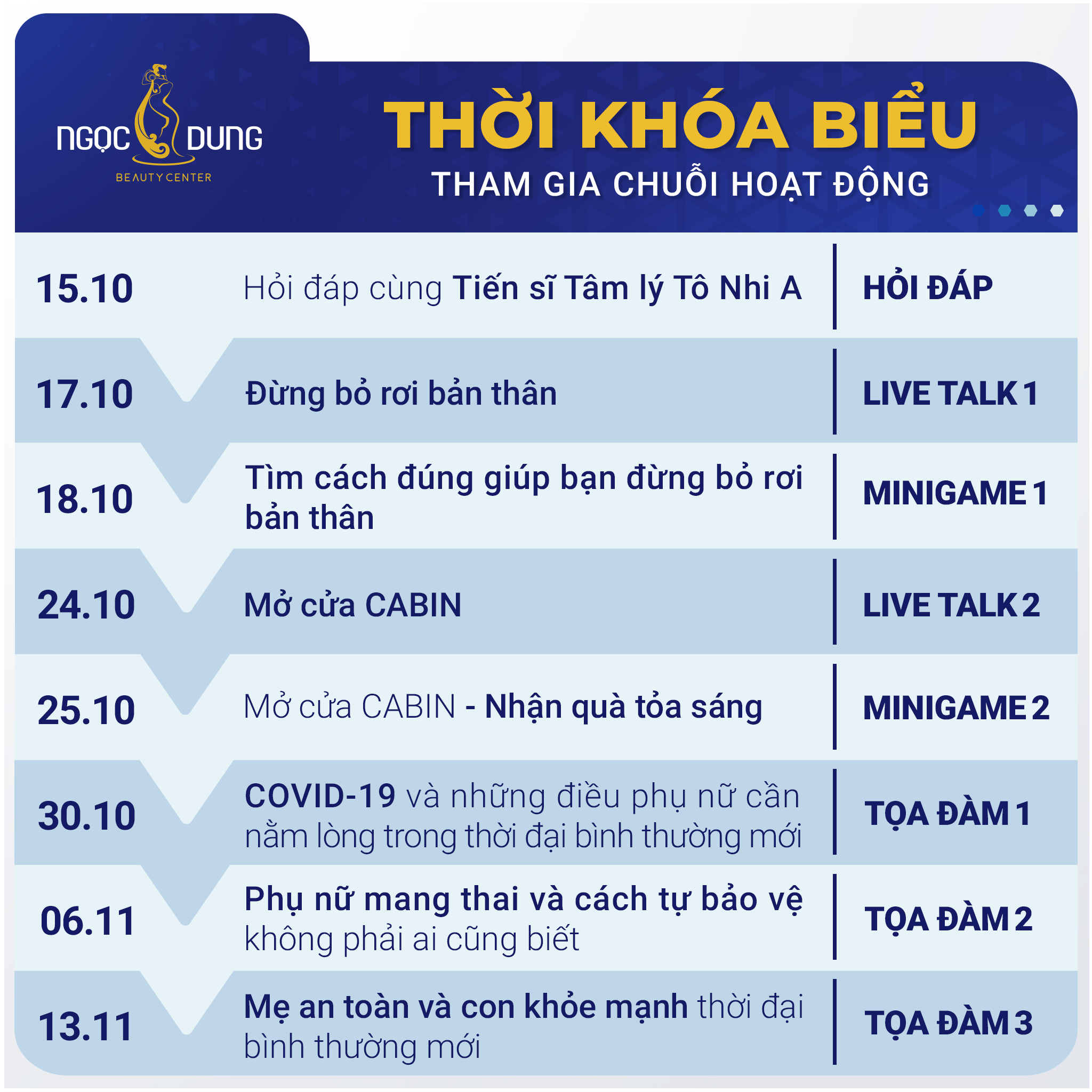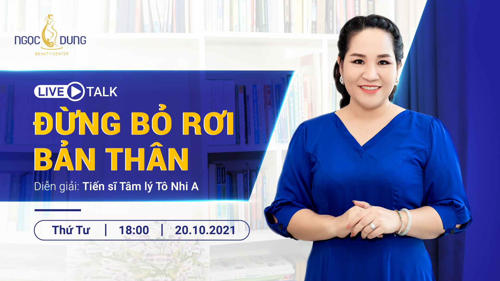 Nằm trong chuỗi hoạt động của chiến dịch “Ngọc Dung Bật Xanh – Sống tích cực & vượt nỗi lo” được Hệ thống Thẩm mỹ viện Ngọc Dung khởi xướng. Live Talk sẽ được phát song trực tuyến trên Fanpage Ngọc Dung Beauty vào lúc 18h00 ngày 20.10.2021.