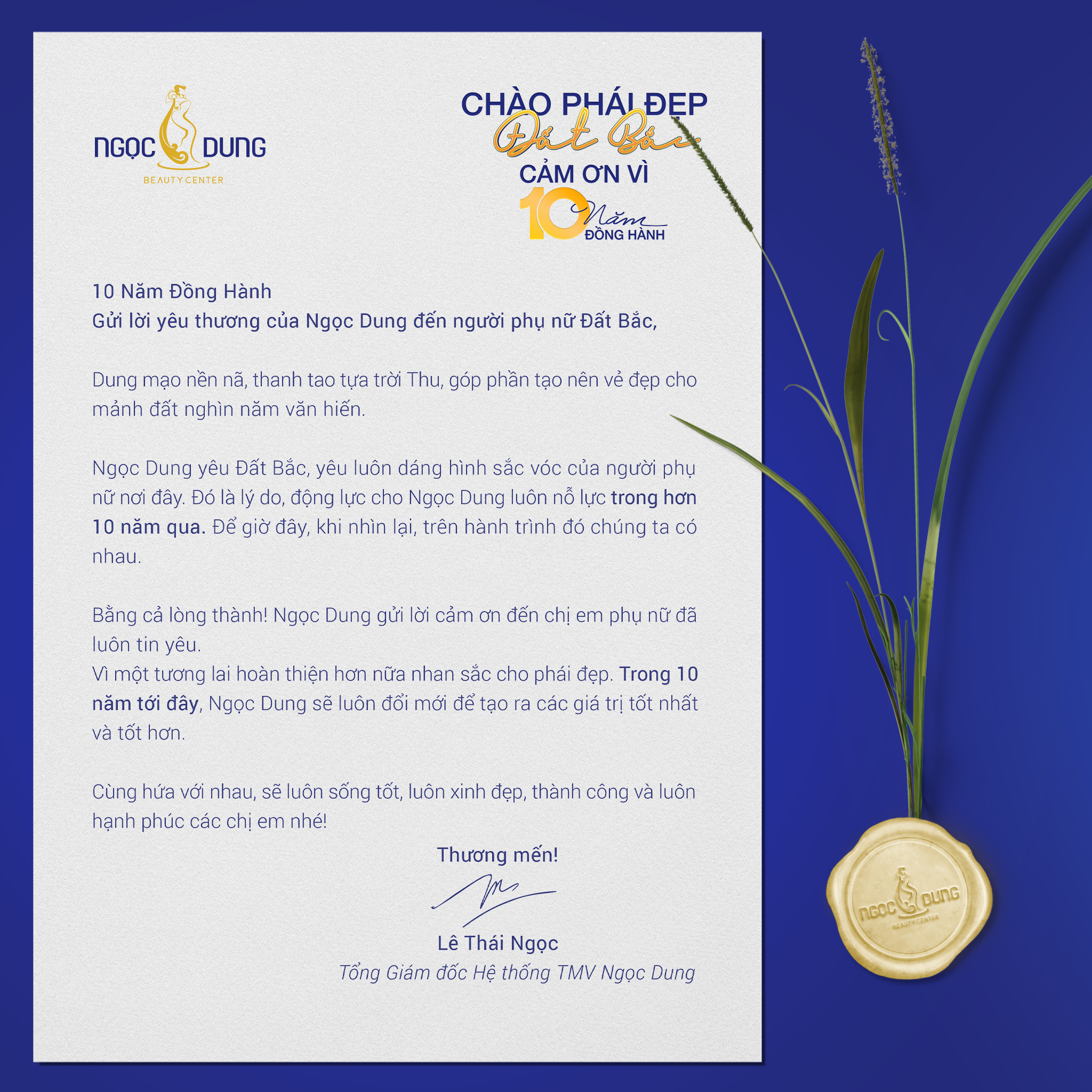 Năm 2022, Hệ thống thẩm mỹ viện Ngọc Dung chào đón một cột mốc quan trọng với kỷ niệm 10 năm đồng hành cùng phái đẹp Đất Bắc. Thông qua sự kiện, thông điệp được truyền tải là lời cảm ơn dành cho khách hàng cùng phái đẹp nơi đây. Bên cạnh đó, còn là ý nguyện tâm tình một cách gần gũi, giữa người đứng đầu Hệ thống Thẩm mỹ viện Ngọc Dung – Bà Lê Thái Ngọc với các chị em phụ nữ. Về việc, cùng hướng đến một tương lai, phụ nữ Việt được đẹp trọn đẹp, được sống hạnh phúc hơn.