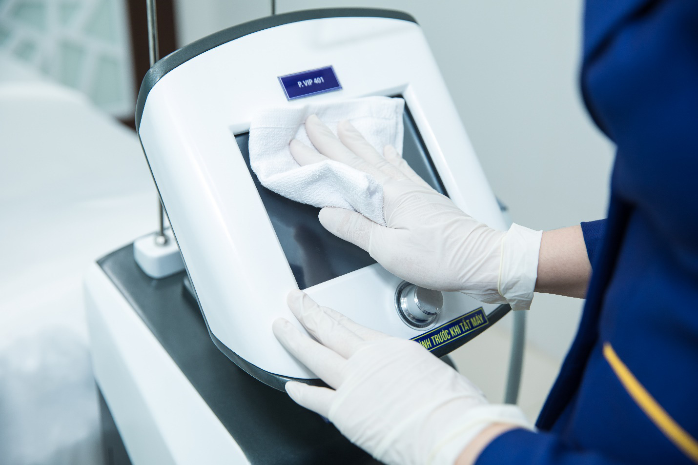 Sau mỗi lượt khách hàng ra về, nhân viên nghiệp vụ sẽ kiểm tra, đảm bảo không có người trong phòng điều trị, bật đèn tia cực tím để khử khuẩn toàn bộ gian phòng. Theo chuyên gia, đèn này có khả năng diệt lên đến 99% vi khuẩn, giúp ngăn chặn nguy cơ lây nhiễm chéo giữa khách hàng với khách hàng, khách hàng với nhân viên