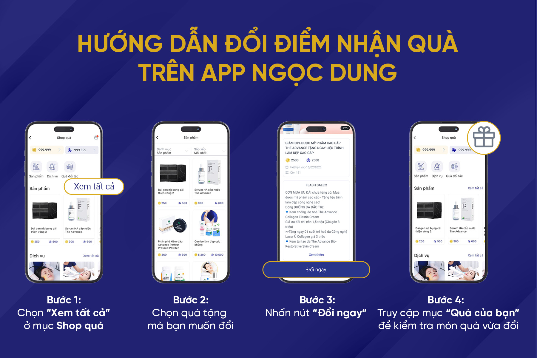 Khách hàng có thể đổi quà thông qua App Ngọc Dung Beauty. Để đổi quà, khách hàng cần thực hiện các bước sau